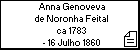 ![]() ![]() ![]() ![]() ![]() ![]() ![]() ![]() ![]() ![]() ![]() ![]() ![]() ![]() ![]() ![]() Ttinha uma fazenda denominada Quintanilha em S. Gonçalo com sua filha D. Ana Teixeira de Noronha. (Fonte: Diário do Rio de Janeiro, ano 1835, edição 1200008, quinta-feira, 10 de dezembro de 1835, p.4) "Declara Ana Genoveva de Noronha Feital que possui na freguesia de Paquetá duas datas de terra que houve por herança do falecido coronel Eugenio José da Silva Teixeira, uma destas tem na testada que faz na Praia do Senhor do Bom Jesus do Monte trinta e duas braças e meia de estrada...e fundos na estrada que vam da frequesia... e a outra data de terras tem cinco braças de testada na estrada que vem da freguesia... e faz fundos no cume do morro aguas vertentes com confrontaçoes" (Fonte: BR RJANRIO 3D. RGT. D16. FQT. 7598/36, f.012A)(data de produçao 19/12/1855) "Joaquim José de Noronha e Juliao José de Noronha agradecem cordialmente a todas as pessoas que se dignárao acompanhar ao ultimo jazigo os restos mortaes de sua muito prezada mae, D. Anna Genoveva de Noronha Feital, e de novo lhes rogao o caridoso obsequio de assistirem às missas de setimo dia, as quais serao celebradas na segunda-feira, 23 do corrente [julho de 1860], às 8 1/2 horas, nas igrejas da ordem Terceira da Immaculada Conceiçao (rua do Sabao), e do Senhor do Bom Jesus do Monte, em Paquetá." (Fonte: Correio Mercantil, anno XVII, no.201, sabado, 21 de julho 1860, pg. 4) Consta que morreu solteira de diaréia, o que significa que nunca foi oficialmente casada com Eugenio José da Silva Teixeira com quem teve filhos. (Fonte: Diario do Rio de Janeiro, anno XL, no. 116, quinta-feira, 19 de julho 1860, pg.1 sob "Obituários). Consta no Arquivo Nacional no "Indice da collecção alvarás, cartas e provisões, 1753-1808", p. 284 uma carta de emancipação datada de 28 abril 1806 na f. 255. |